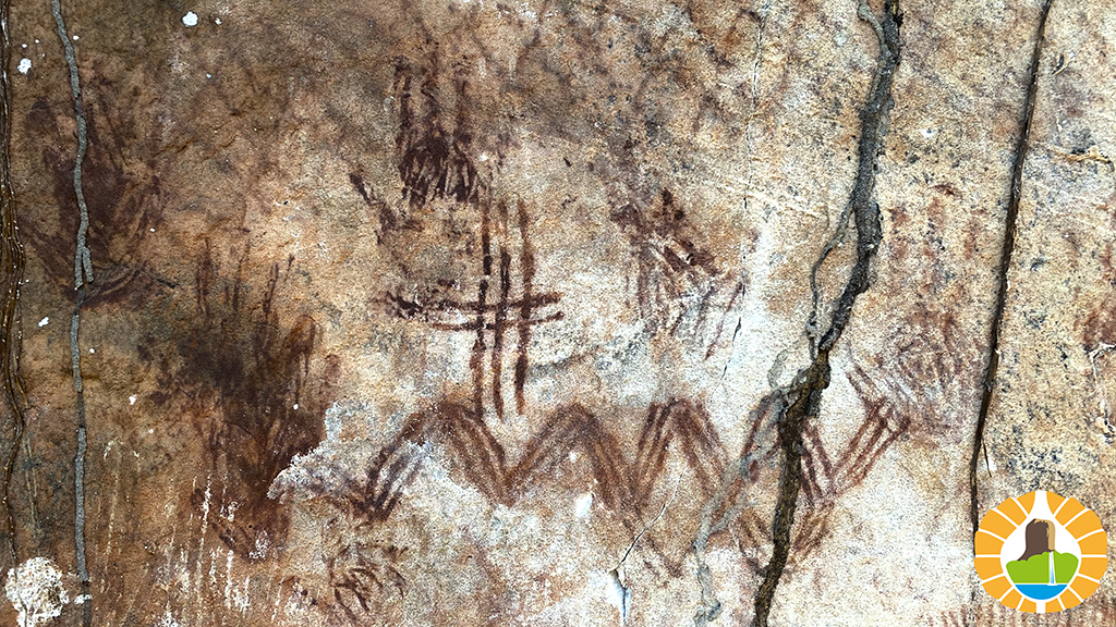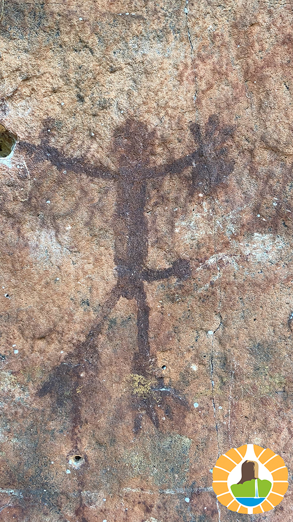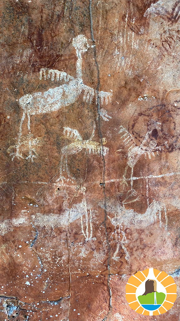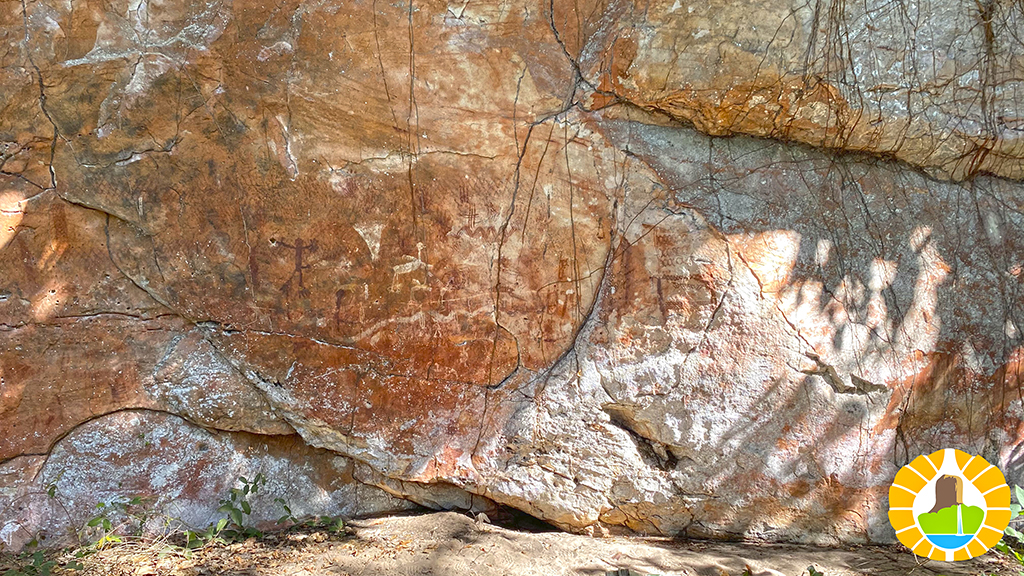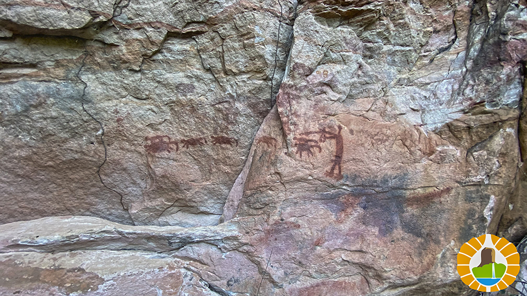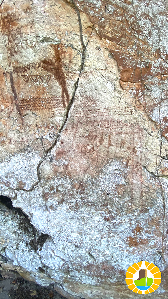Después de 7 km de serranías, tenemos la recompensa de llegar a la gran pared de piedra en las faldas del cerro, y apreciar variadas figuras en colores rojo y blanco de Arte Rupestre.