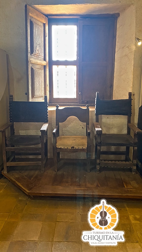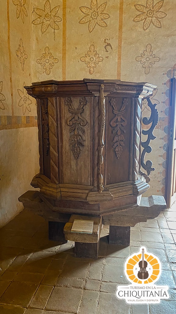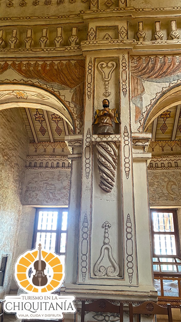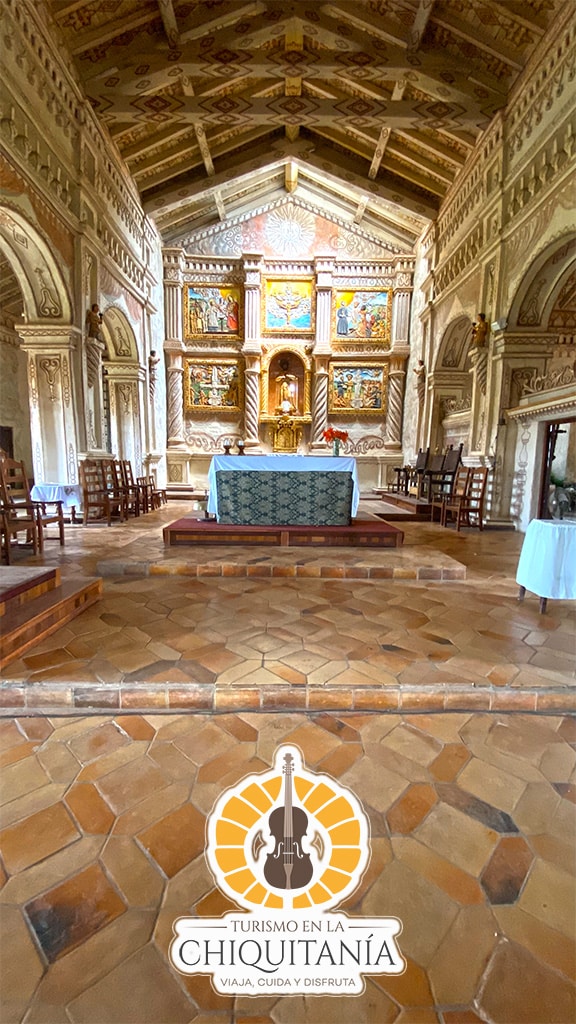 En su interior destacan las columnas pintadas, las esculturas de ángeles dorados y los retablos de adobe moldeado, que reflejan la maestría artística de la época misional. El conjunto misional, ubicado junto a la plaza principal, incluye también el campanario, el patio del colegio y la casa parroquial, evocando la rica tradición cultural y espiritual de San Javier.