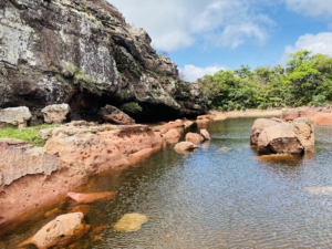 Las pozas mas altas, Comunidad El Portón, Roboré, Chiquitos. Paisajes hermosos de pozas con aguas cristalinas en lo alto de las serranías, donde las nubes beben sus aguas, como olas movidas por los vientos de la Chiquitanía, donde las constelaciones se dejan ver por un claro cielo de aire limpio. Ubicadas a 3.5 km aproximadamente